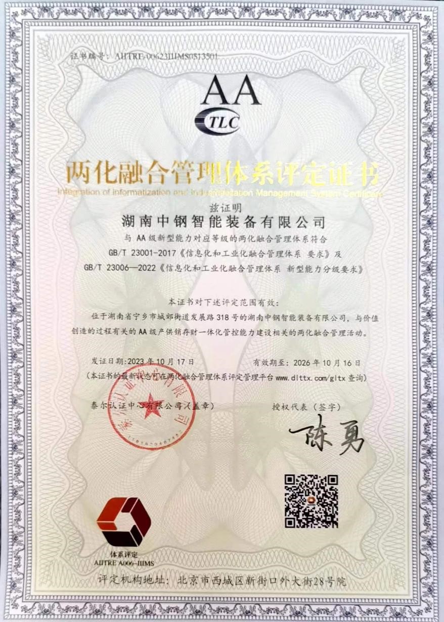 近日,球友会网页版_球友会(中国)官方集团旗下球友会网页版_球友会(中国)官方智能装备有限公司顺利通过国家工业和信息化部 GB/T 23001-2017 《信息化和工业化融合管理体系要求》及GB/T23006-2022《信息化和工业化融合管理体系 新型能力分级要求》体系认证,获得AA级两化融合管理体系评定证书,标志着球友会网页版_球友会(中国)官方智能装备有限公司在新型工业化的道路上迈上新台阶。