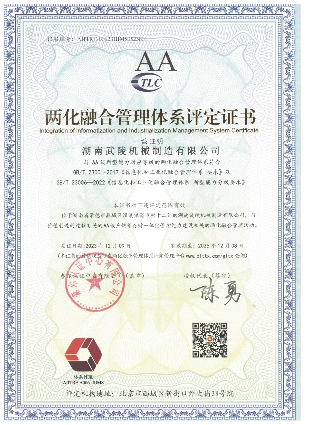 让我们共同祝贺武陵机械获得两化融合管理体系 AA 级评定证书!