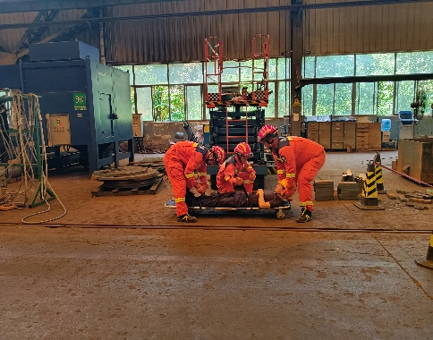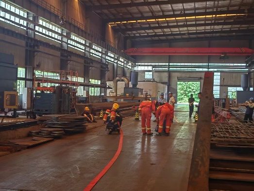 救援大队接收到西部重工下料车间北一跨P18处等离子切割机发生火灾,且一名人员被困。到达现场后,消防救援大队依据现场实际情况及相关人员介绍制定救援方案,根据方案,消防救援人员协同我司消防设施操人员开展灭火救援工作,最终,在共同的努力下,人员救出,火灾扑灭。