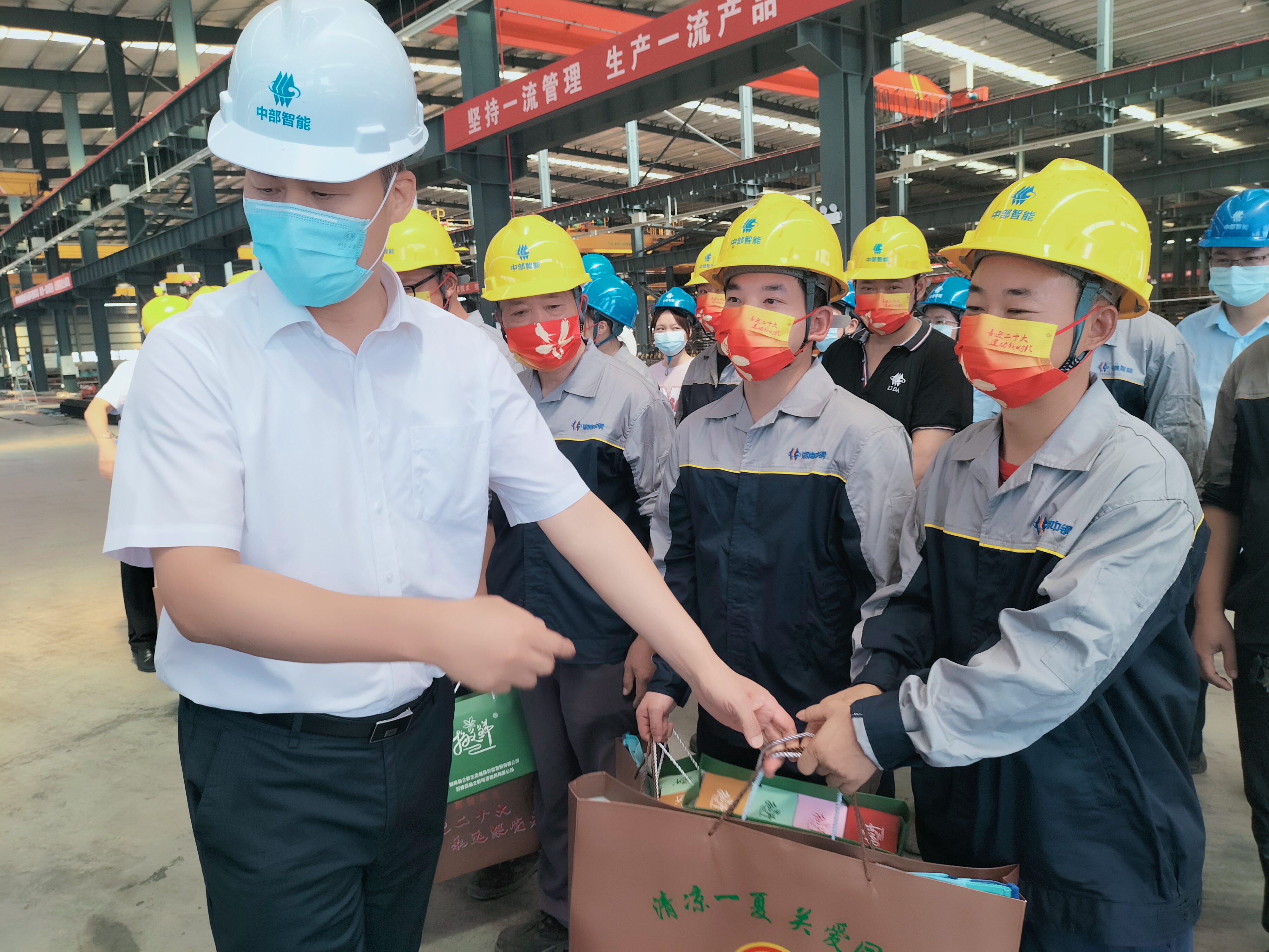 8月11日娄底市委副书记、政法委书记尹华凯,市人大党组副书记、副主任、市总工会主席李有才,经开区主任肖雄杰一行到中部智能“夏送清凉”慰问员工,集团公司董事长岳俊峰、总经理胡伟成也亲临现场,向在高温天气下辛勤工作的职工表示了亲切的问候,并送上了防暑降温物品,同时叮嘱相关负责人要落实好防暑降温工作。
